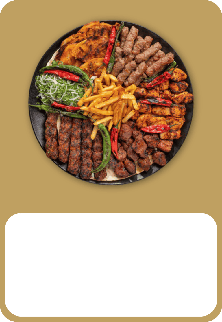 Eine Auswahl saftiger Kebap-, Lamm- und Hähnchenspieße, serviert mit Salat, Hummus und Ihrer Wahl aus Reis oder Pommes – ein echtes Highlight für Fleischliebhaber.